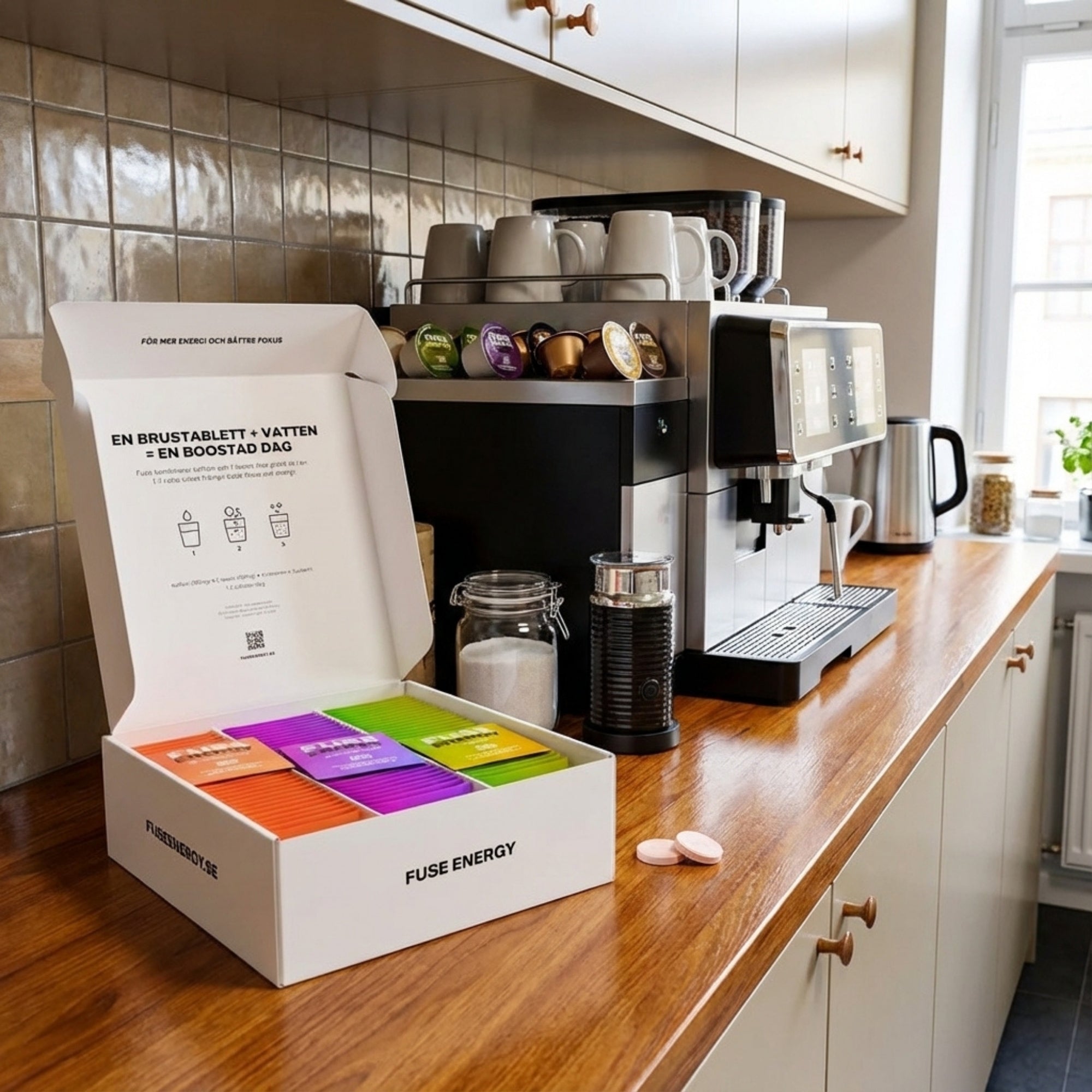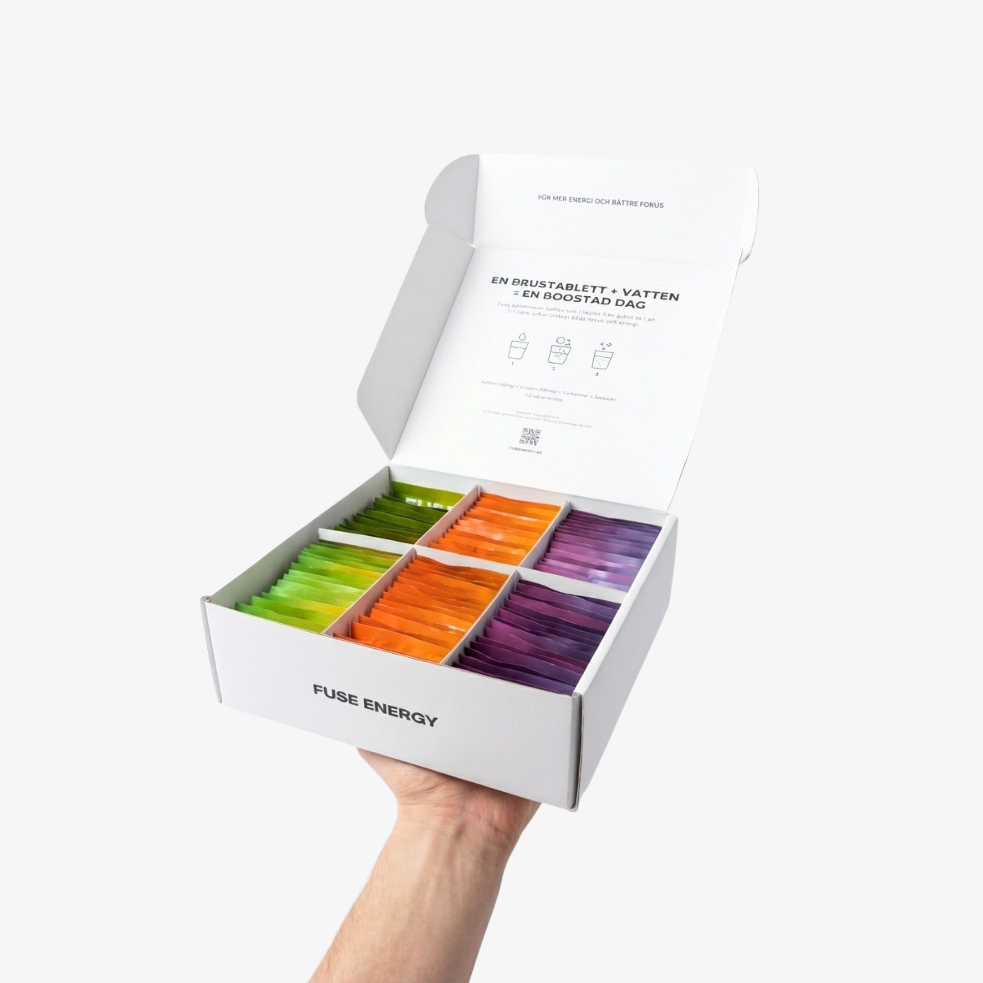 En stilren box fylld med 90st av våra styckförpackade brustabletter i flera smaker. Perfekt för kontoret, studierummet, hemmaköket eller receptionen. Bara tillsätt vatten och få ren, fräsch energi.
